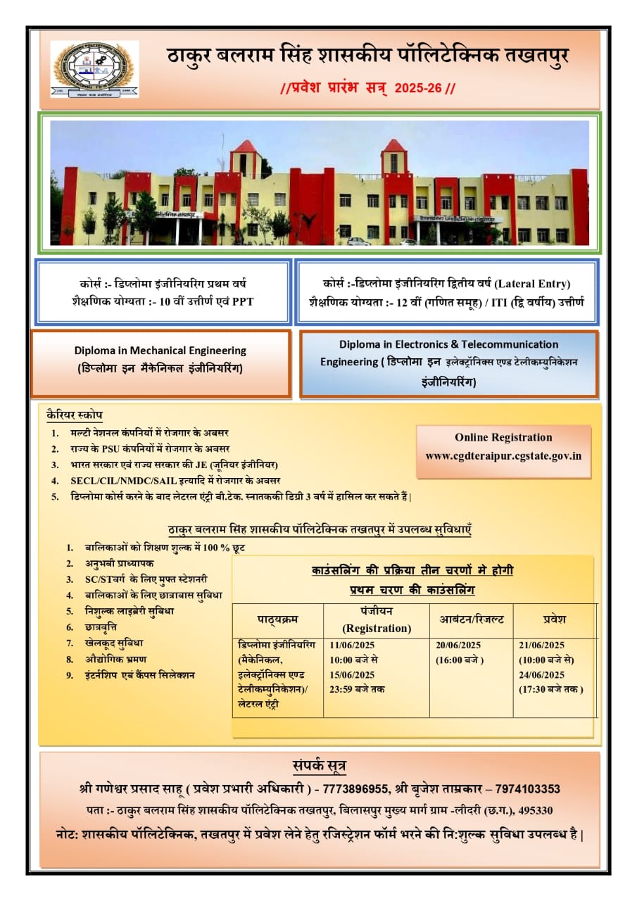 UNIVERSITY BHILAI (C.G.). Government Polytechnic Takhatpur is situated at 25 KM from